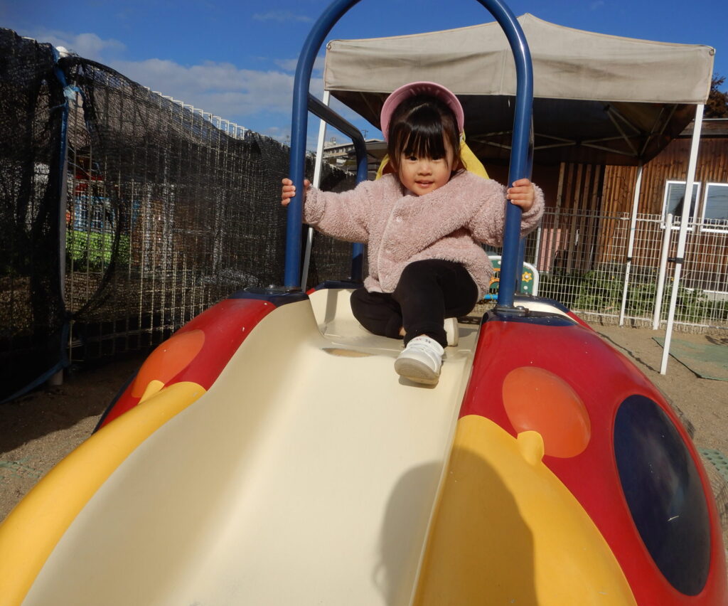 4月当初は自分で登るのもまだ難しかった子も今は手すりをしっかり持って上手に滑ることができています。友だちとも順番に滑れるように保育者は友だちが滑り終わったら次の友だちが滑れるように見守りながら声をかけています。