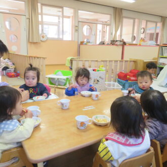 ゆめぐみ(0歳児)の子どもたちは、戸外で思い切り遊びおなか空かせておいしい給…