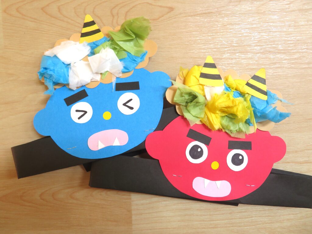 ねらい: 花紙をちぎったり、丸めたりして鬼の頭につけたり、顔のパーツを貼ることを楽しむ。