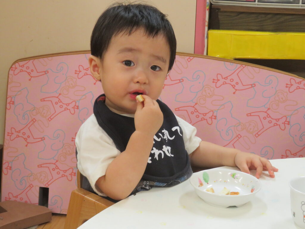 給食では、自分でスプーンを持って食べようとしたり、手づかみ食べをしたりしながら、自分で食べることを楽しんでいます。保育者に食べさせてもらいながら食事を楽しむ子もいれば、自分んですくうのが難しい子には保育者が手を添え口元へ運んだり、自分でスプーンを持って食べたりと月齢によって姿も様々です。「食べたい。」という気持ちが強く片方の手にスプーンを持ち、反対の手で手づかみをして食べることもあり意欲いっぱいの姿が見られます。食後のデザートとしてみかんやバナナを保育者が用意すると「バナナ!バナナ!」と言い嬉しそうな表情で「早くちょうだい!」とアピールし、にっこりと笑顔で美味しそうに食べています。