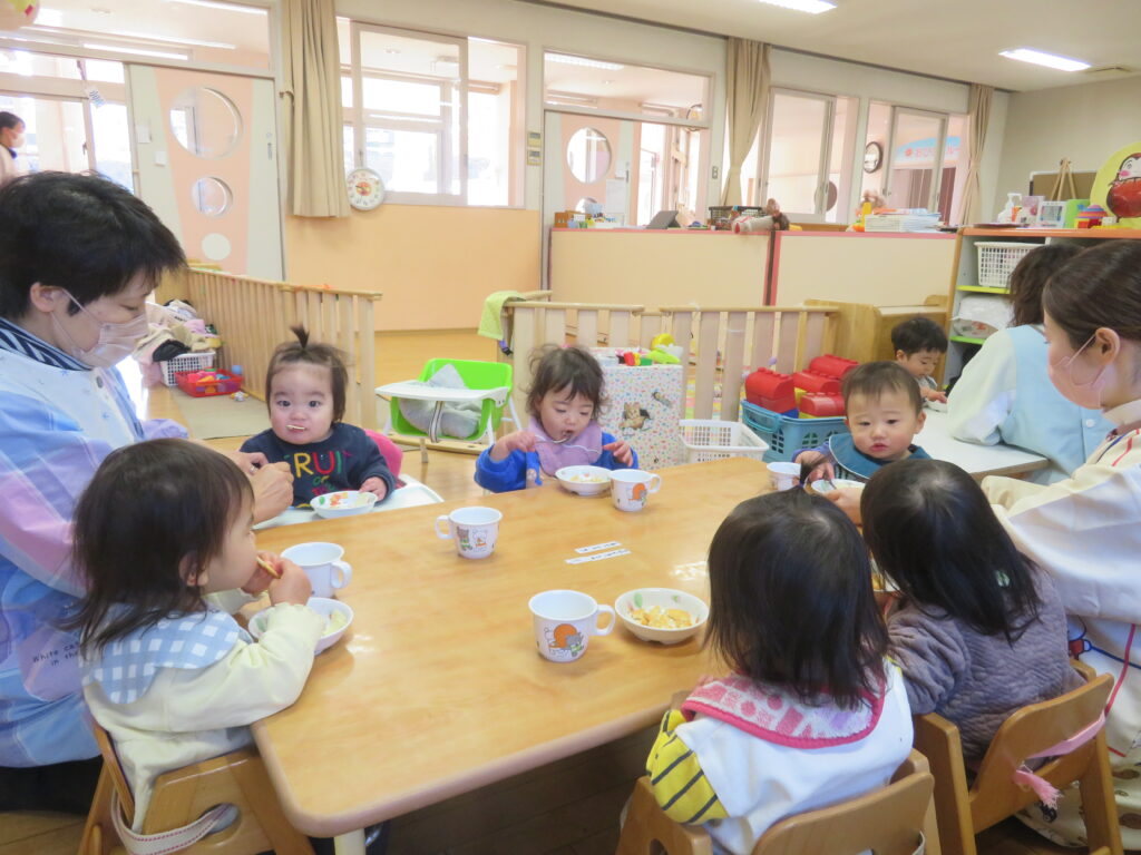 離乳食から幼児食になり、1日3食と朝と3時のおやつを食べて元気になり、しっかり遊んで眠たくなるという生活のリズムができています。園の給食では色々な食材や旬の野菜を使った食事が提供されています。子どもたちはさまざまな食べ物に出会い「これな何かな?」「おいいしいな。」と感じ、好きな食べ物が増えています。