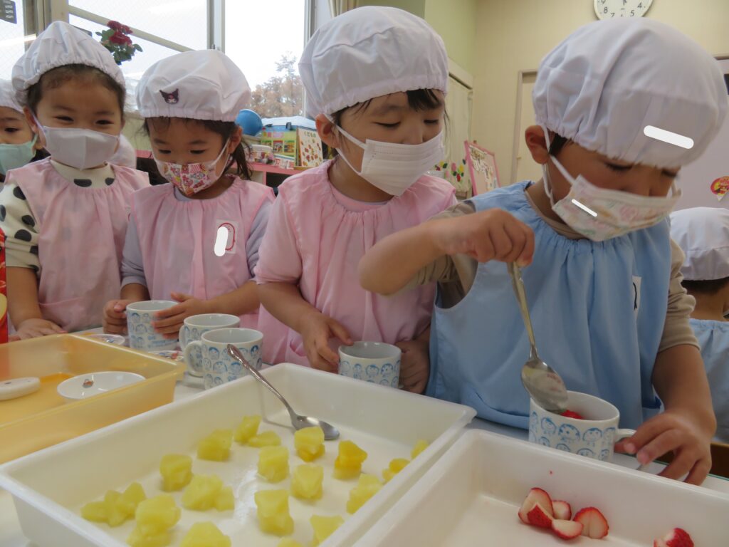 「いちごおいしい!」「みかんあった!」と自分が入れた果物を見つけたり、好きな果物を食べて嬉しそうに知らせる姿も見られました。みんなで作って食べると、よりおいしいですね。