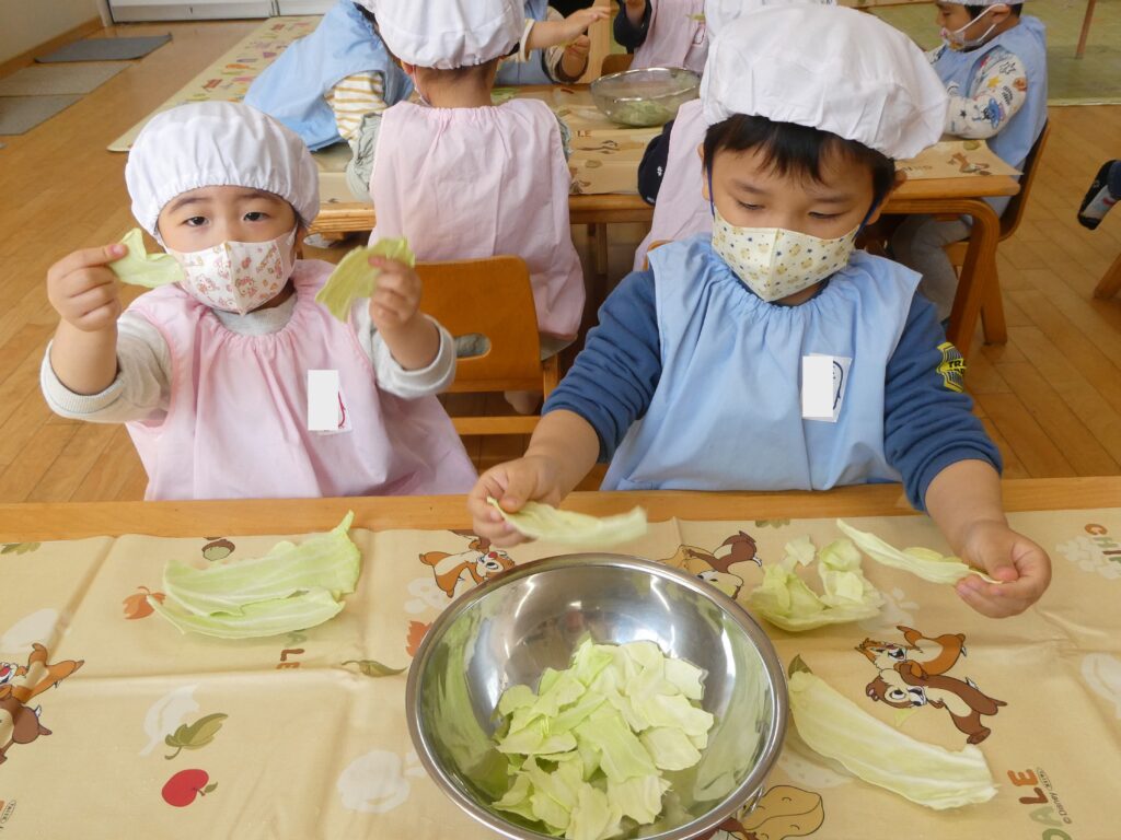 キャベツは柔らかいため、包丁を使わなくても小さくできることを知りました。「食べやすい大きさにちぎってみてね。」と声を掛けると「先生、これくらい?」「これなら食べれる!」と聞いたり考えたりしながら、ちぎることを楽しんでいました。