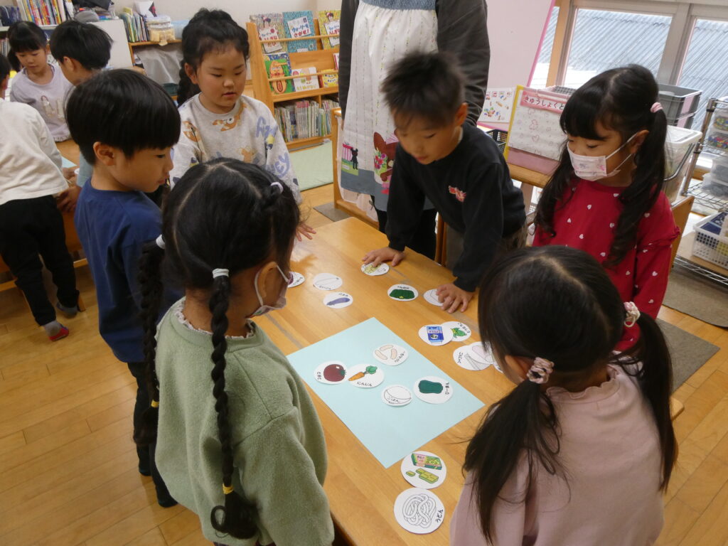 その後、食材カードを配り、「カレーに入っているものを選ぼう」「お味噌汁に入っている野菜はなにかな?」